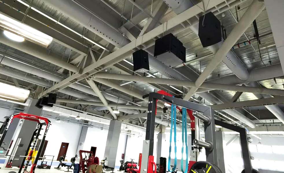主擴音箱采用SR1562全頻音箱,吊裝在場地兩側,根據健身房的實際長度調整每只音箱音域的輻射角度,確保覆蓋無死角,作為全場的主擴聲使用。