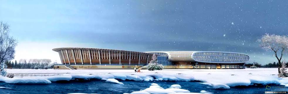 北京市冰上項目訓練基地位于延慶城中心,總建筑面積8萬多平方米,主要包括綜合訓練館、教學管理公寓樓及其他附屬設施。從空中俯瞰,圓角方形場館和半圓形場館連成一體,西側綜合館為半圓形,如同半個“冰球”,東側訓練館為八邊形,似一個方形的“冰壺”。