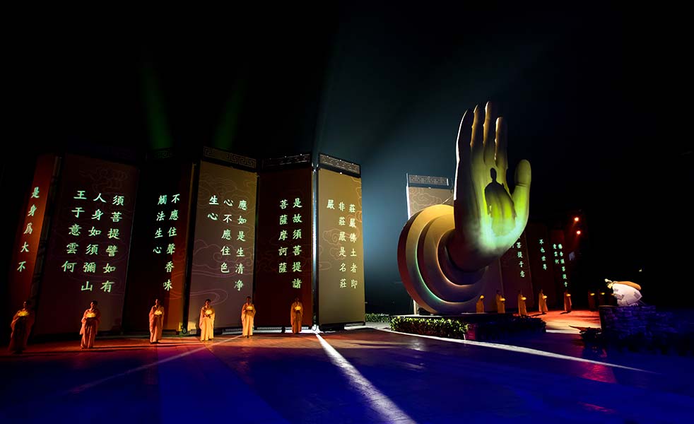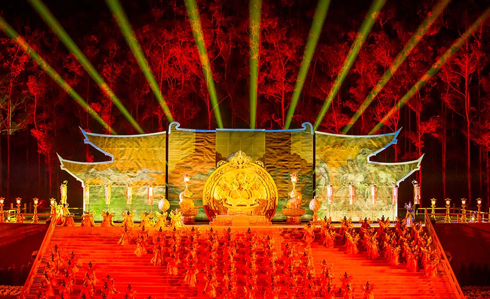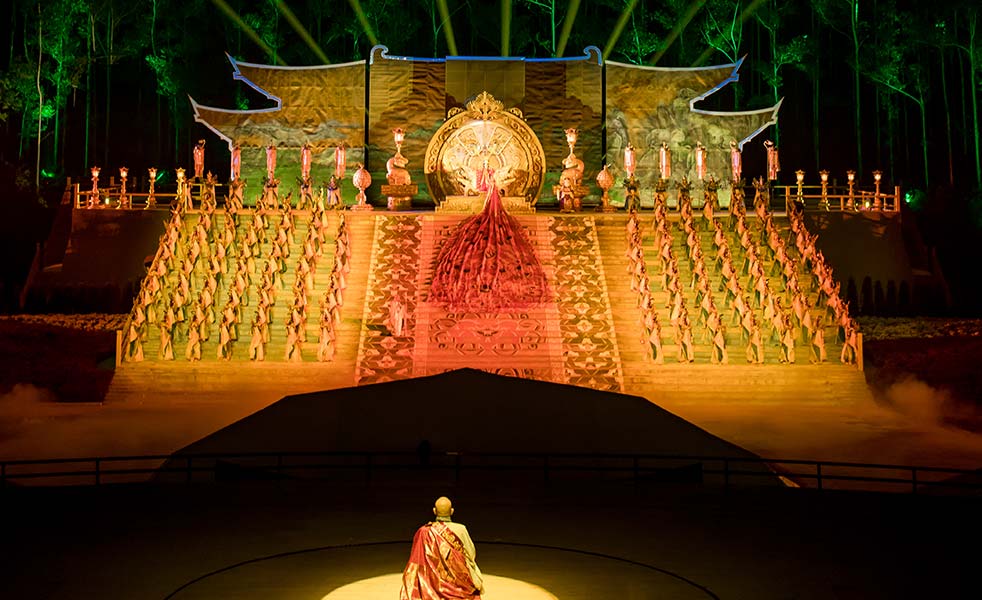 《禪宗圣域?六祖惠能》匯聚國家級主創(chuàng)團隊,融合全球最新現(xiàn)代光影技術(shù),歷時三年的精心籌備,由500多位專業(yè)演職人員傾情演繹、1800名觀眾共同參與,觀眾即演員,行走即修行,創(chuàng)新性地改變了一般的觀演關(guān)系,呈現(xiàn)一出全球最大規(guī)模、最具特色、最具新意的禪文化音畫大典。成就一部觀眾親自參與的禪意巨作、打造一場光影與時空融匯的禪意盛宴、啟迪一次人生修行的禪悟之旅。