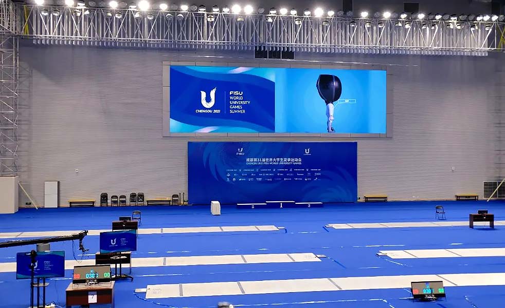 郫都區體育中心,作為成都大運會的重要比賽場館之一,是本屆大運會擊劍項目唯一的比賽場館。為保障賽事工作,滿足大運會需求,場館進行改造、升級,將原先的籃球館、游泳館、羽毛球館改造成擊劍決賽館、預賽館、熱身館。