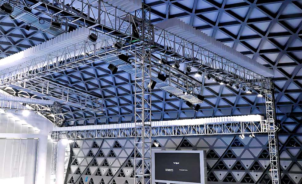 在東西觀眾區,為了更好地平衡聲場,每個區域共吊裝了4只LAX PS12 3D束波可旋轉號角揚聲器,同樣每1只為1組,共計4組。南北觀眾區,一共吊裝了16只揚聲器,每2只揚聲器為1組,共計8組,從而形成一種和諧的音場效果。