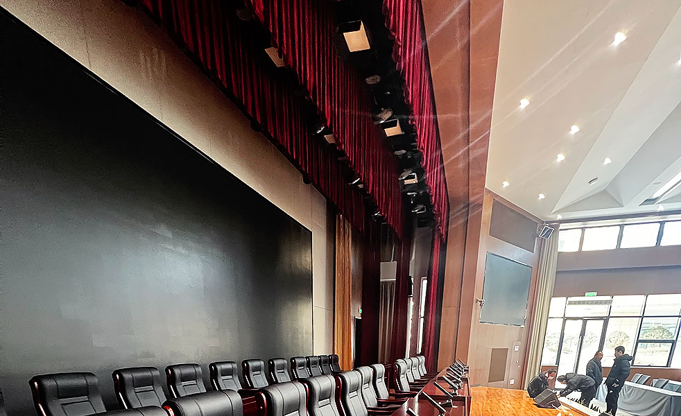 我司為本項目舞臺機械幕布系統配備:1道前檐幕、1道對開大幕、3道燈光吊桿、1道固定面光、2道橫側幕吊桿、1道景物吊桿、1道對開底幕,臺上電氣與控制系統。