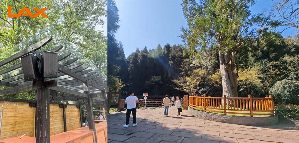 在百年古樹旁邊一個廊亭上,桿頂掛采用兩只TR110定制版全天候防水全頻揚聲器,音源跟隨投影畫面同步控制。