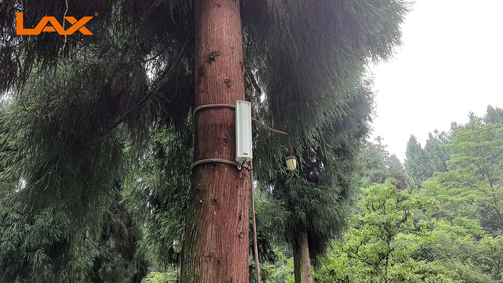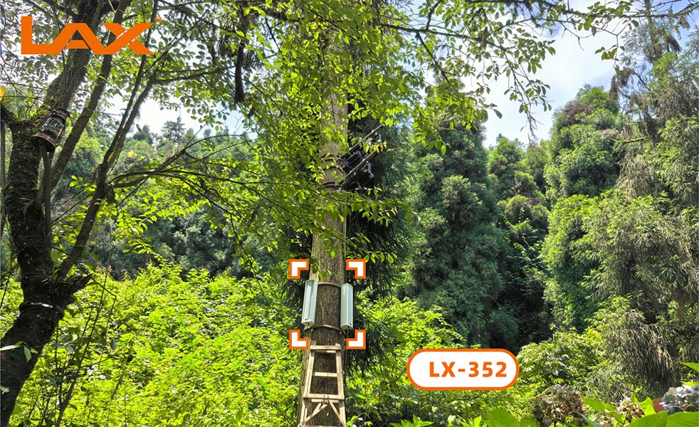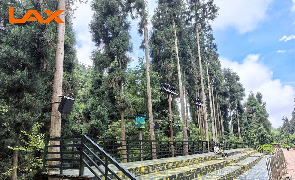 在熒光棧道、熒光科普館、出發-卵、歧途森林步道、寺廟外墻等,采用LX-352戶外防水廣播音柱,用抱箍的方式安裝在樹干上,作為每個區域的背景音樂擴聲系統。使用物聯網系統智能化控制,保證每一個區域定時播放不同的音樂,進行單點區域的背景擴聲。