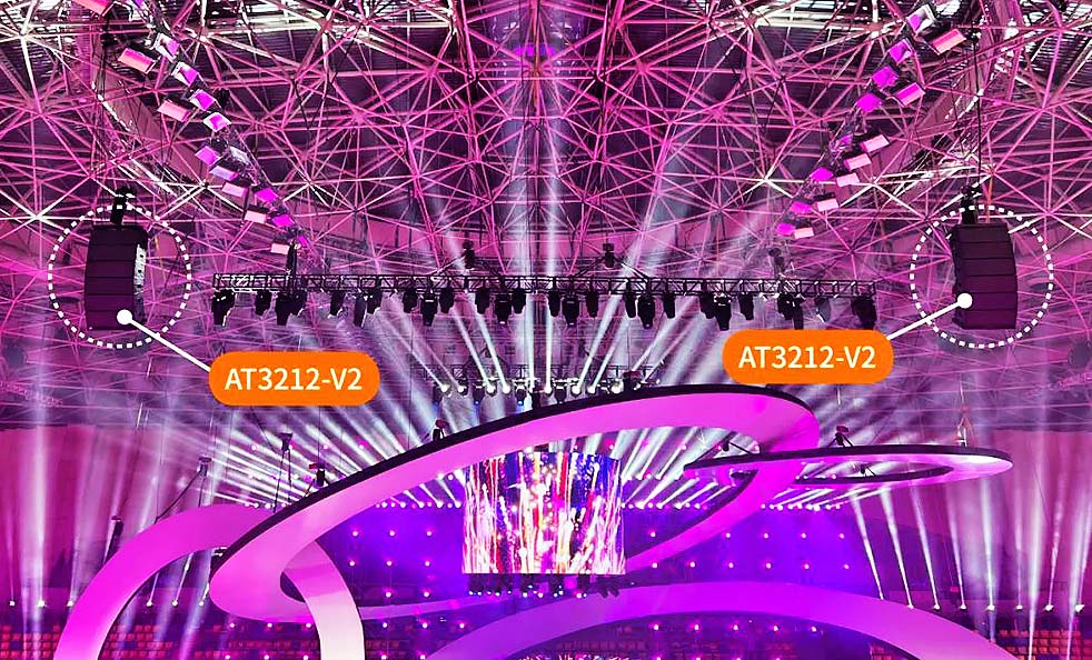 主擴分左右聲道2組,每組6只AT3212-V2線陣揚聲器,吊掛安裝并覆蓋主席臺側觀眾席區域。