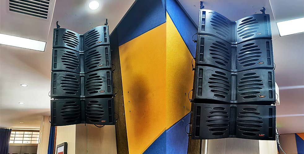 報告廳主擴聲揚聲器選用兩組LAX AT系列線陣音響,每組由6只LAX AT208雙8寸線性陣列音箱組成,吊掛安裝在舞臺左右兩側(cè)。