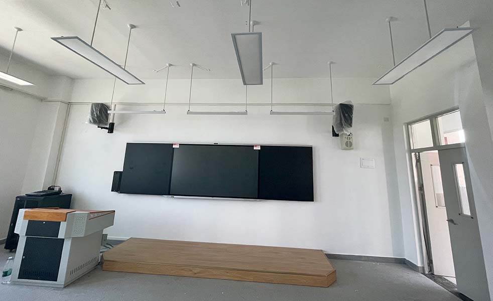 1、100平方以內(nèi)課室采用智能交互壁掛終端搭配2只30W壁掛音箱;