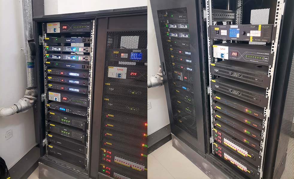 功率放大器選用LAX ATSD系列和LAX MT系列。其中,5臺LAX ATSD1500功放推動主擴線陣音箱,1臺LAX MT2400功放推動超低頻音箱,1臺LAX ATSD400功放推動臺唇音箱,2臺LAX ATSD1000功放推動返聽音箱,2臺LAX ATSD1000功放推動環(huán)繞音箱,為聲音提供強勁動力。同時,數(shù)字音頻處理由4臺LAXDS408數(shù)字音頻處理器控制,優(yōu)化音箱系統(tǒng),調(diào)整最佳性能狀態(tài)。