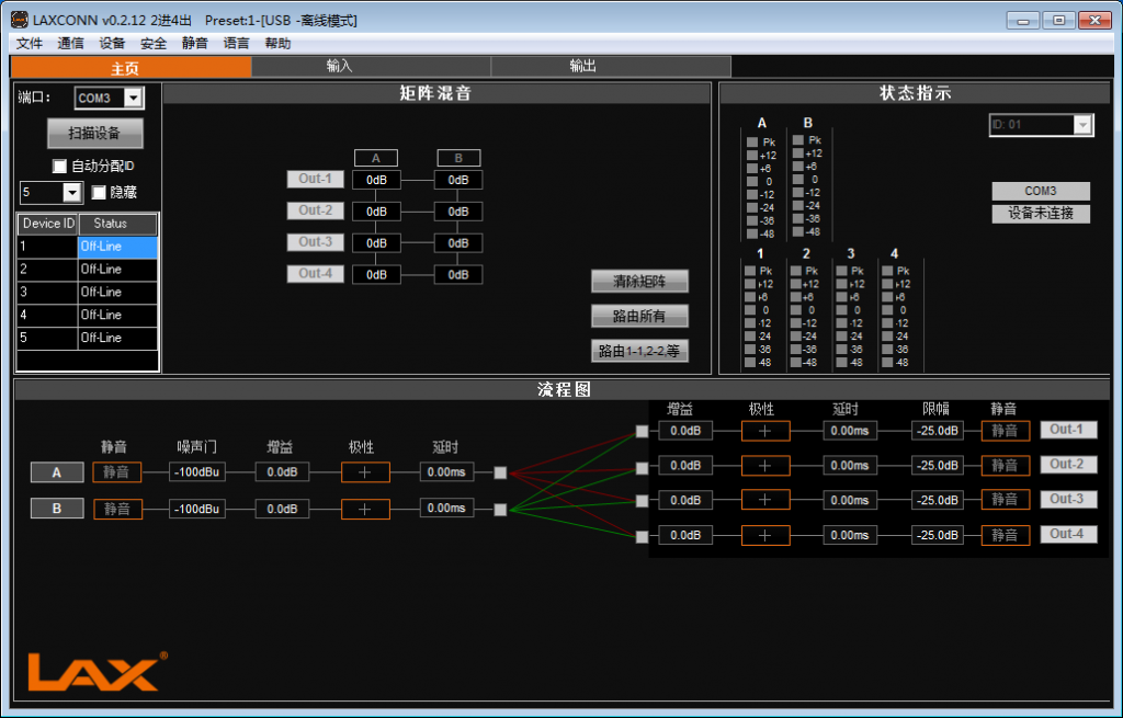 搭配該模塊的PC端控制軟件-LAX CON,遠(yuǎn)程調(diào)控音箱系統(tǒng)參數(shù),使用時更加靈活方便。LAX CON支持靜音、增益、EQ/高低通、限幅、延遲、溫度設(shè)定、橋接、補(bǔ)償?shù)葏?shù)處理。
