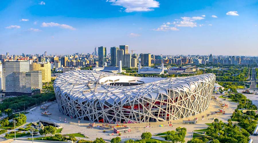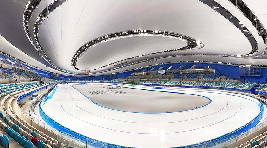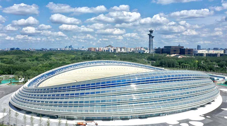 國家速滑館是北京2022年冬奧會北京主賽區標志性場館、唯一新建的冰上競賽場館。它的設計理念來自一個冰和速度結合的創意,22條晶瑩美麗的“絲帶”狀曲面玻璃幕墻就像運動員滑過的痕跡,象征速度和激情,因此又被稱為“冰絲帶”。2022年北京冬奧會期間它將承辦速度滑冰比賽。